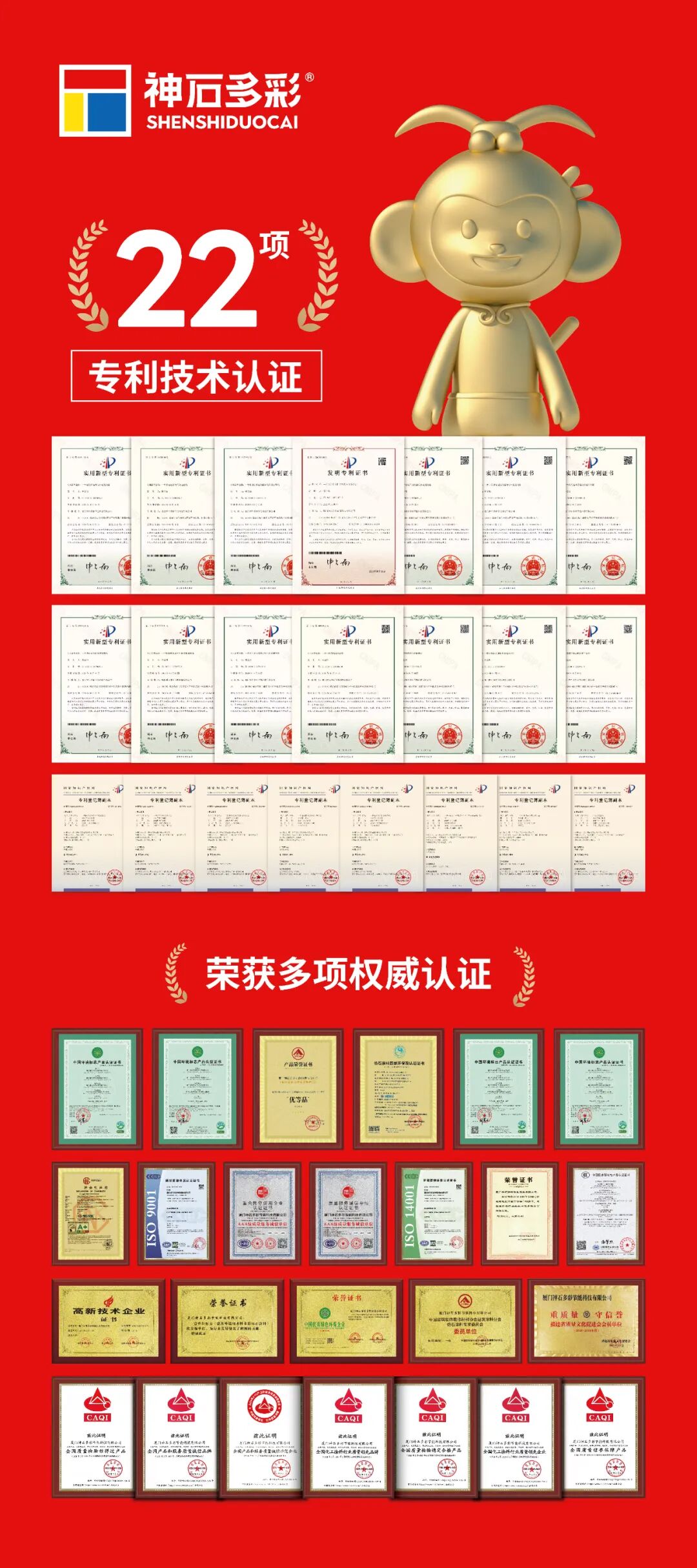 自2008年树立以来,神石仿石漆一直视质量为生命线。依托生产基地与专业开发团队,公司累计获22项国家专利,构建起含玉石、莱姆石、天然冠晶石、5D大理石漆、艺术漆等全系列新产品的质量系统。